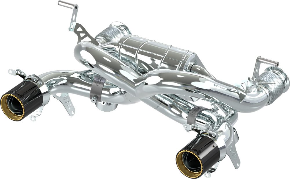 | 02 LA 082 03 038 | Endschalldämpfer mit Abgasklappen und X-Pipe mit Hitzeschutz inkl. CES-3 mit genehmigung für den Lamborghini Huracán EVO und Lamborghini Huracán STO. Zurzeit ist bei Fahrzeugen mit Partikelfilter eine ECU Programmierung erforderlich! Die Anlage ist mit ECE Genehmigung. Bitte beachten Sie die zulässigen Fahrzeugtypen in der ECE Genehmigung. |